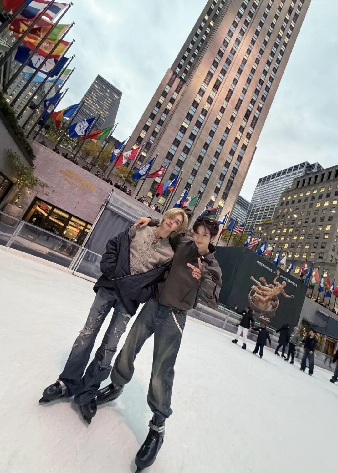 朴元彬与好友同行,简约黑色外套内搭中式盘扣上衣,沉稳中藏着东方雅致。下身搭配随性牛仔裤,利落又自在,于冰场中自成格调。